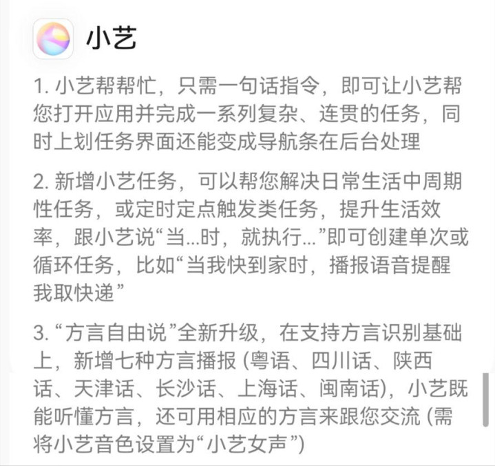 而且这一次的小艺直接新增粤语、四川话在内的7 种方言播报,这不是锦上添花,而是覆盖更多场景的数据基础。