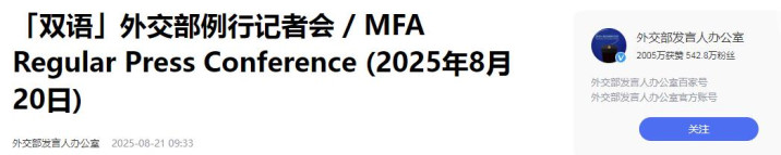 「双语」外交部例行记者会 / MFA Regular Press Conference (2025年8月20日)——外交部发言人办公室
